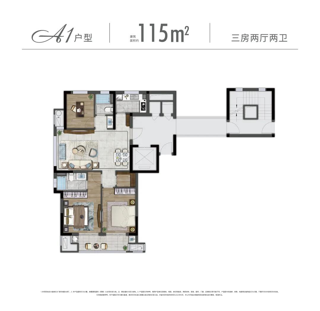 而115㎡同樣作為明星戶型,則更注重陽光、景致與居住私密性。三面采光+餐客廳一體+套房式主臥+雙聯(lián)陽臺(tái),將品質(zhì)與靜謐的生活周到考量,在一方美好空間里,可觀、可賞、可憩。